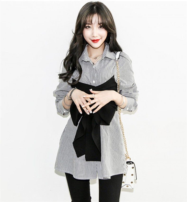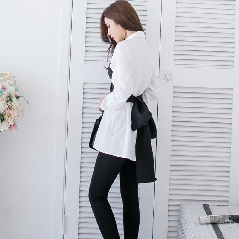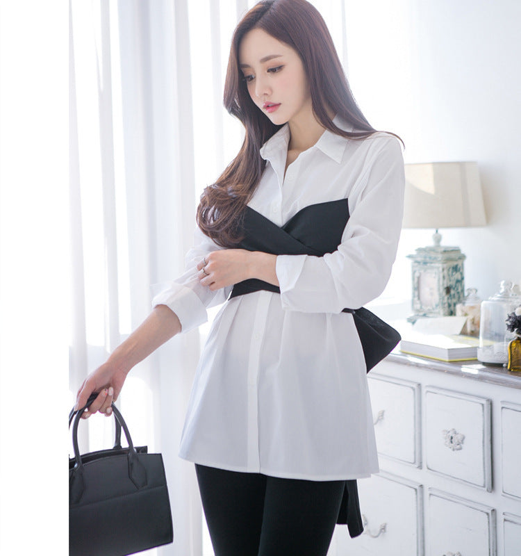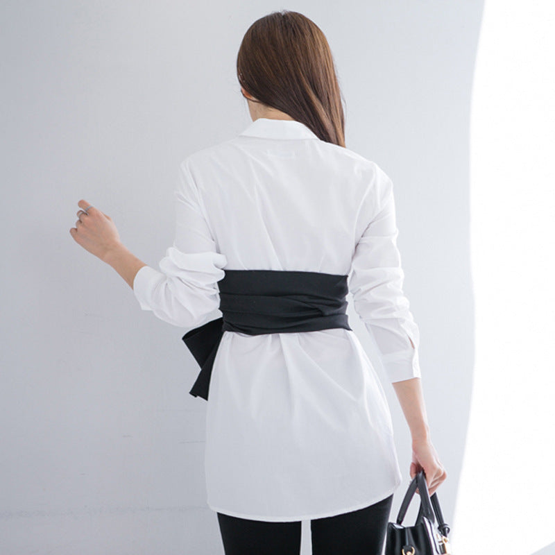 Strike a Pose: The Edgy Chic White Dress Shirt with Black Bodice Accent and Bow