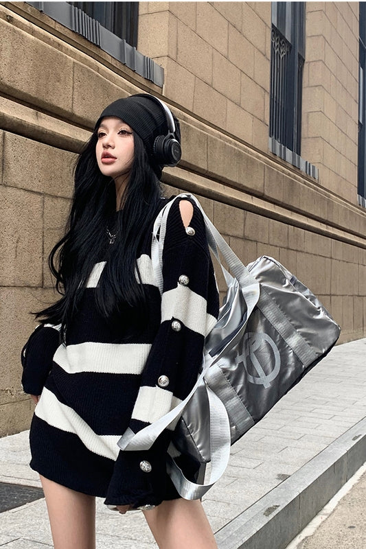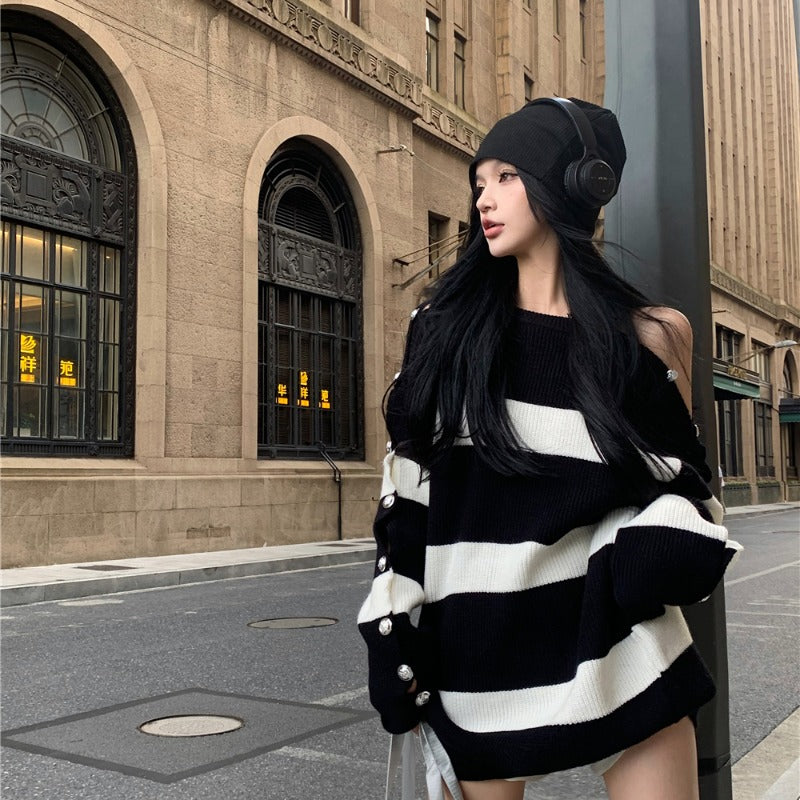 Effortless Chic: Open Shoulder Button Sleeve Detail Striped Loose Sweater (Black/White)