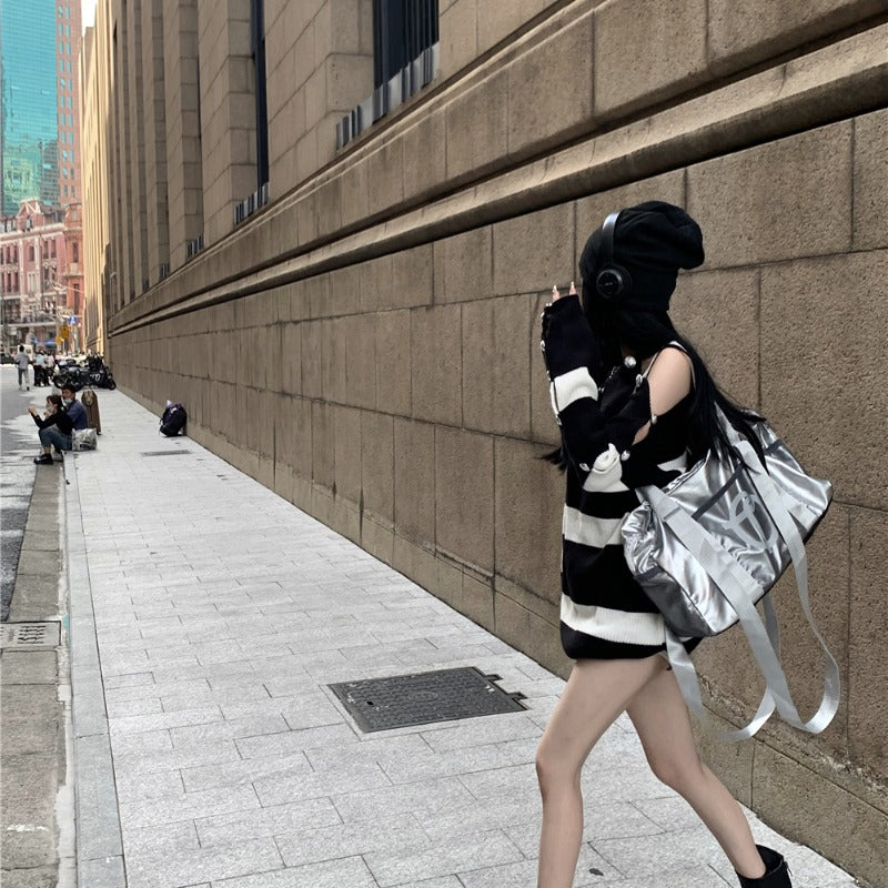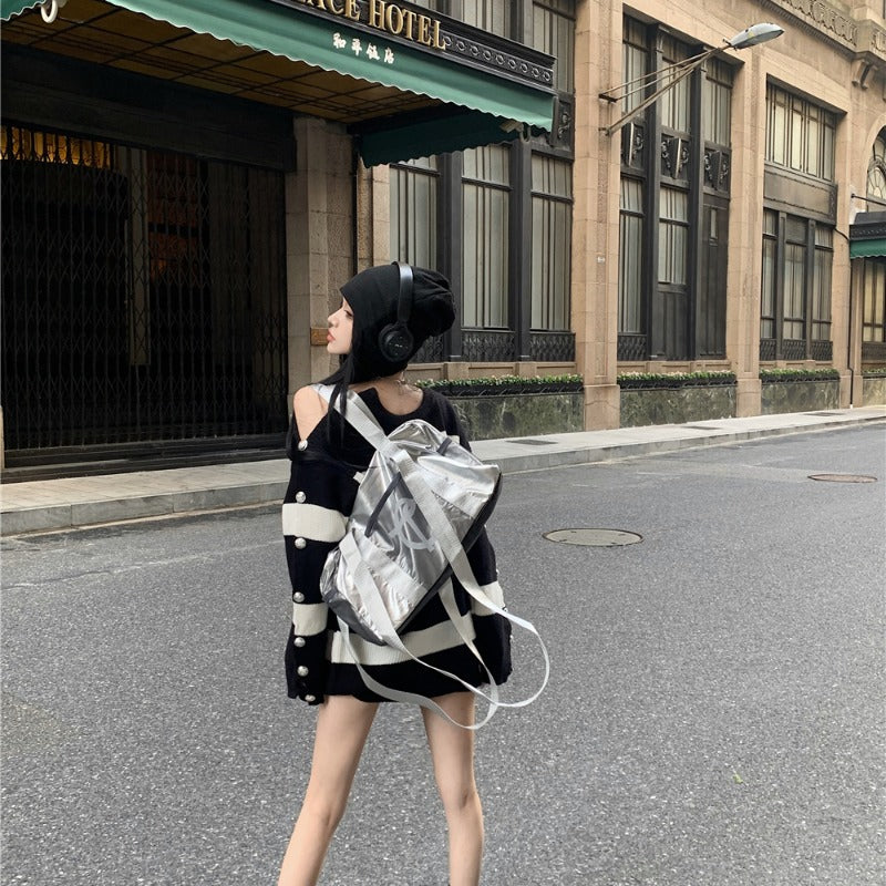 Introduce a touch of Parisian flair to your wardrobe with our Open Shoulder Button Sleeve Detail Striped Loose Sweater. This black and white beauty combines timeless elegance with a modern twist, making it a must-have for any fashion-forward woman.