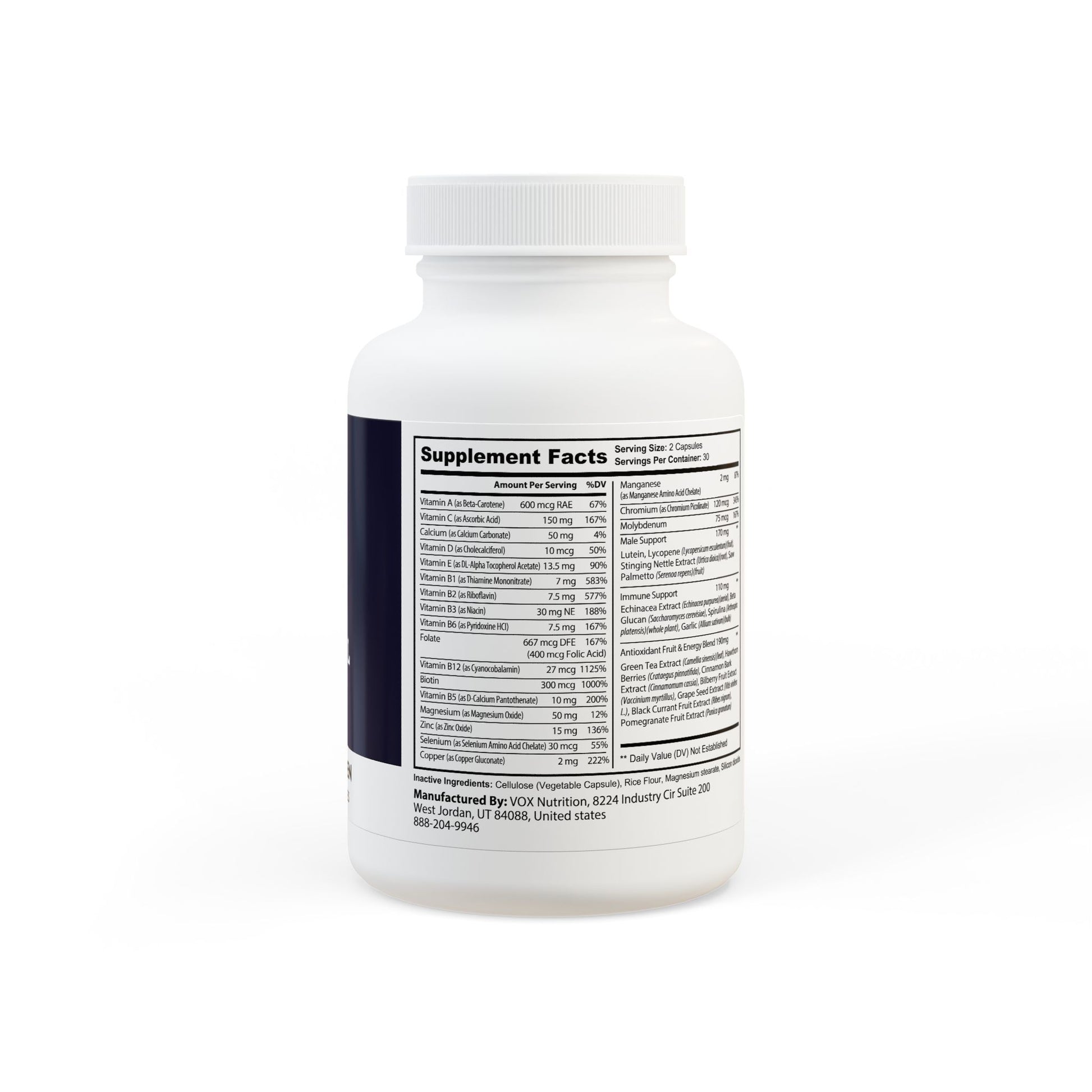 Ingredients: Vitamin A (as Beta-Carotene), Vitamin C (as Ascorbic Acid), Calcium (as Calcium Carbonate), Vitamin D (as Cholecalciferol), Vitamin E (as DL-Alpha Tocopherol Acetate), Vitamin B1 (as Thiamine Mononitrate), Vitamin B2 (as Riboavin), Vitamin B3 (as Niacin), Vitamin B6 (as Pyridoxine HCI), Folate, (400 mcg Folic Acid), Vitamin B12 (as Cyanocobalamin), Biotin, Vitamin B5 (as D-Calcium Pantothenate), Magnesium (as Magnesium Oxide), Zinc (as Zinc Oxide), Selenium (as Selenium Amino Acid Chelate), Copper (as Copper Gluconate), Manganese (as Manganese Amino Acid Chelate), Chromium (as Chromium Picolinate), Molybdenum, Lutein, Lycopene (Lycopersicum esculentum)(fruit), Stinging Nettle Extract (Urtica dioica)(root), Saw Palmetto (Serenoa repens)(fruit), Green Tea Extract (Camellia sinensis)(leaf), Hawthorn Berries (Crataegus pinnatida), Cinnamon Bark Extract (Cinnamomum cassia), Bilberry Fruit Extract(Vaccinium myrtillus), Grape Seed Extract (Vitis vinifera L.), Black Currant Fruit Extract (Ribes nigrum), Pomegranate Fruit Extract (Punica granatum), Echinacea Extract (Echinacea purpurea)(aerial), Beta Glucan (Saccharomyces cerevisiae), Spirulina (Arthrospira platensis)(whole plant), Garlic (Allium sativum)(bulb). Inactive Ingredients: Cellulose (Vegetable Capsule), Rice Flour, Magnesium stearate, Silicon dioxide.