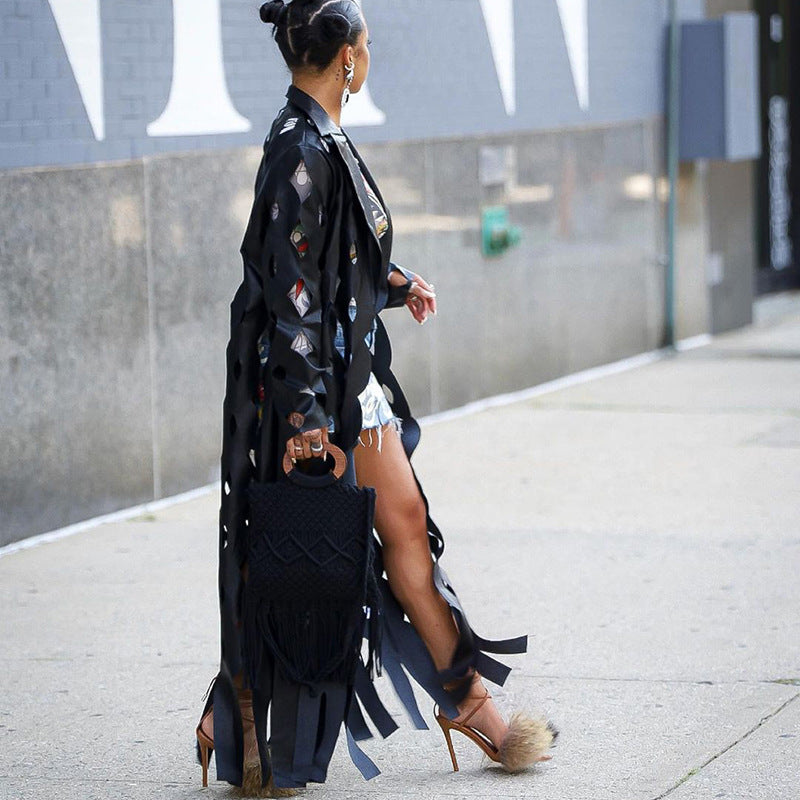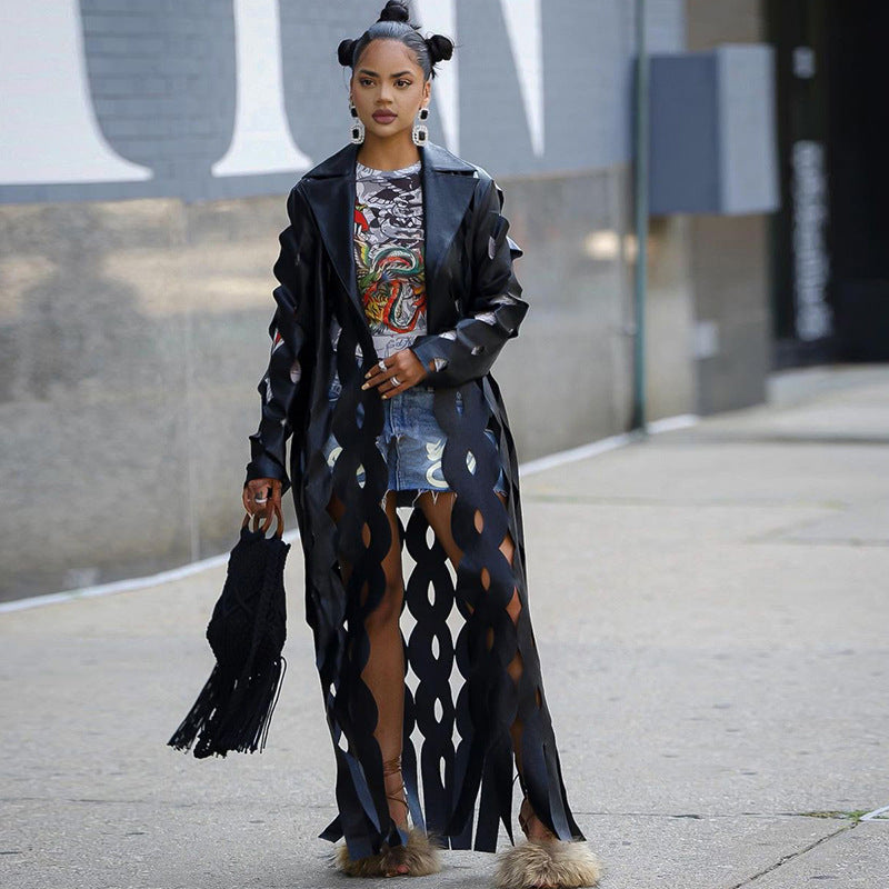 Embrace a modern twist on a timeless classic with our Women's Cut-Out Long Trench Coat in Black. This statement piece is perfect for the fashion-forward woman who wants to stand out from the crowd.